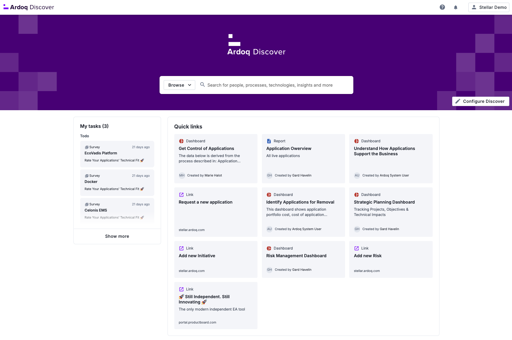 Ardoq is a dynamic, data-driven tool for Enterprise Architecture and a key tool for your digital transformation journey. The software helps organizations and businesses plan, execute, and predict the impact of change across their people, projects, strategies, processes, applications, infrastructure, and capabilities. With Ardoq, fresh data creates a dynamic overview that provides insights for better decisions. Through the aid of dashboards, interactive visualizations, and diagrams, users can focus on understanding interdependencies between technology and people, and less time documenting.
